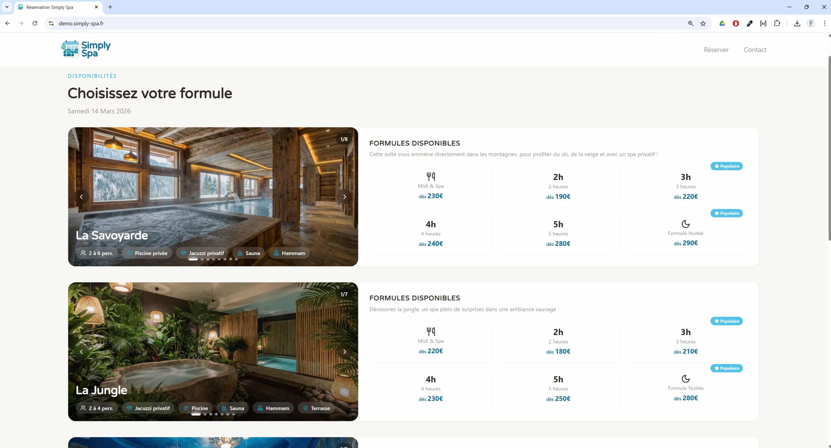 Dans l'univers du bien-être, l'image est votre meilleur argument de vente. Un agenda textuel classique casse brutalement l'imaginaire. Nous avons banni les grilles austères au profit d'un design digne d'un magazine haut de gamme. Chaque étape du tunnel d'achat est illustrée, valorisant vos bassins, vos éclairages tamisés et vos suites de luxe. Tout au long de son parcours, le visiteur peut visualiser les photos de la suite grâce au slider. Le rêve a déjà commencé, et il a commencé à s'imaginer dans votre suite. Les transitions sont douces, les boutons d'action (CTA) sont évidents, et l'ergonomie générale invite à la relaxation avant même que la transaction ne soit finalisée.