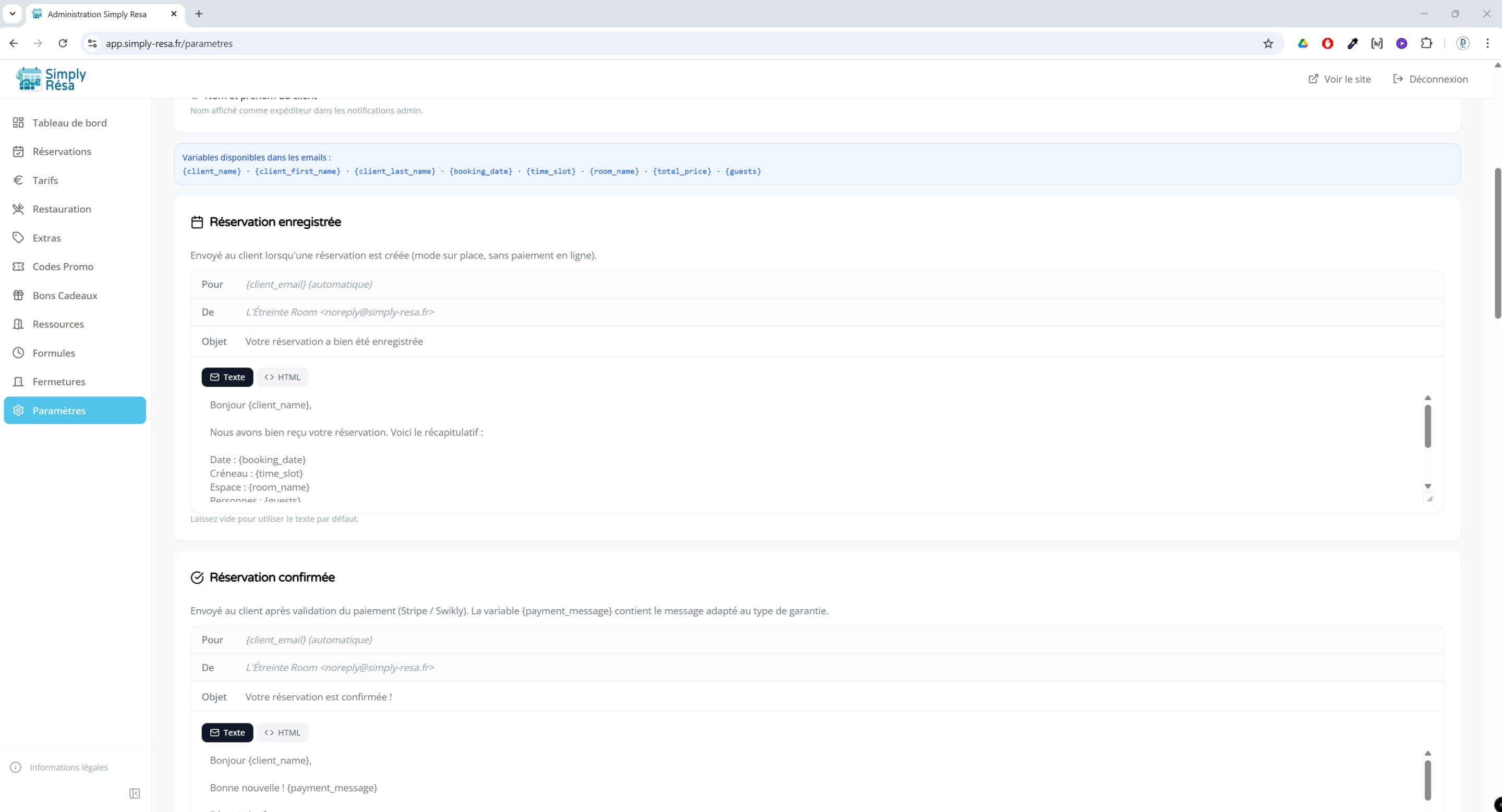 Un message gรฉnรฉrique ou robotique brise instantanรฉment l'illusion du prestige. Vos hรดtes s'attendent ร un traitement privilรฉgiรฉ. Notre technologie intรจgre un puissant systรจme de balises dynamiques (ou variables) qui adapte le texte ร chaque destinataire en temps rรฉel. Le logiciel puise dans la base de donnรฉes pour injecter automatiquement le prรฉnom du client, le nom spรฉcifique de la suite romantique qu'il a choisie, ou encore la liste exacte des supplรฉments qu'il a commandรฉs pour sa soirรฉe. Cette hyper-personnalisation donne la sensation exquise d'un courrier rรฉdigรฉ ร la main, tout en vous garantissant une industrialisation parfaite de vos envois.