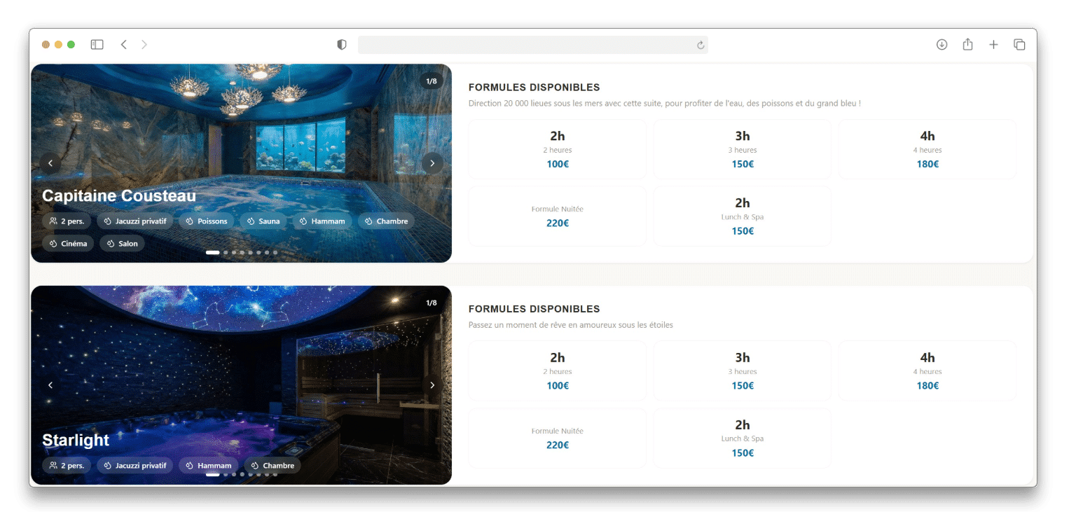 Oui. Contrairement à une chambre d'hôtel classique, une grande partie de la rentabilité d'une Love Room repose sur la vente de services additionnels (Champagne, départ tardif, pétales de roses). Votre site doit donc posséder un tunnel de commande de type "e-commerce" (Upselling) pour proposer ces extras avant le paiement final, ainsi qu'un système de prise de caution automatisée par empreinte bancaire (PLBS).