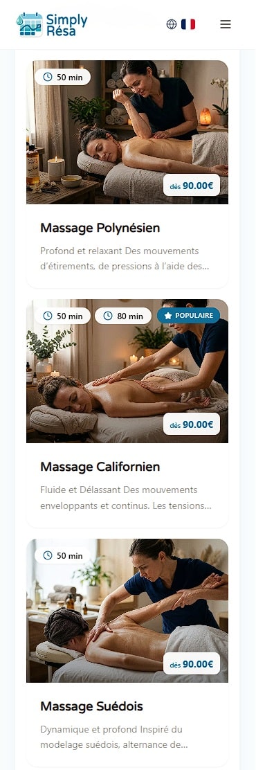 - Recherche par Prestation / Soin : Idéal pour les instituts de beauté et spas. Le client choisit son soin (massage, soin visage, cure), ses options (solo/duo, durée) et trouve facilement le créneau idéal.