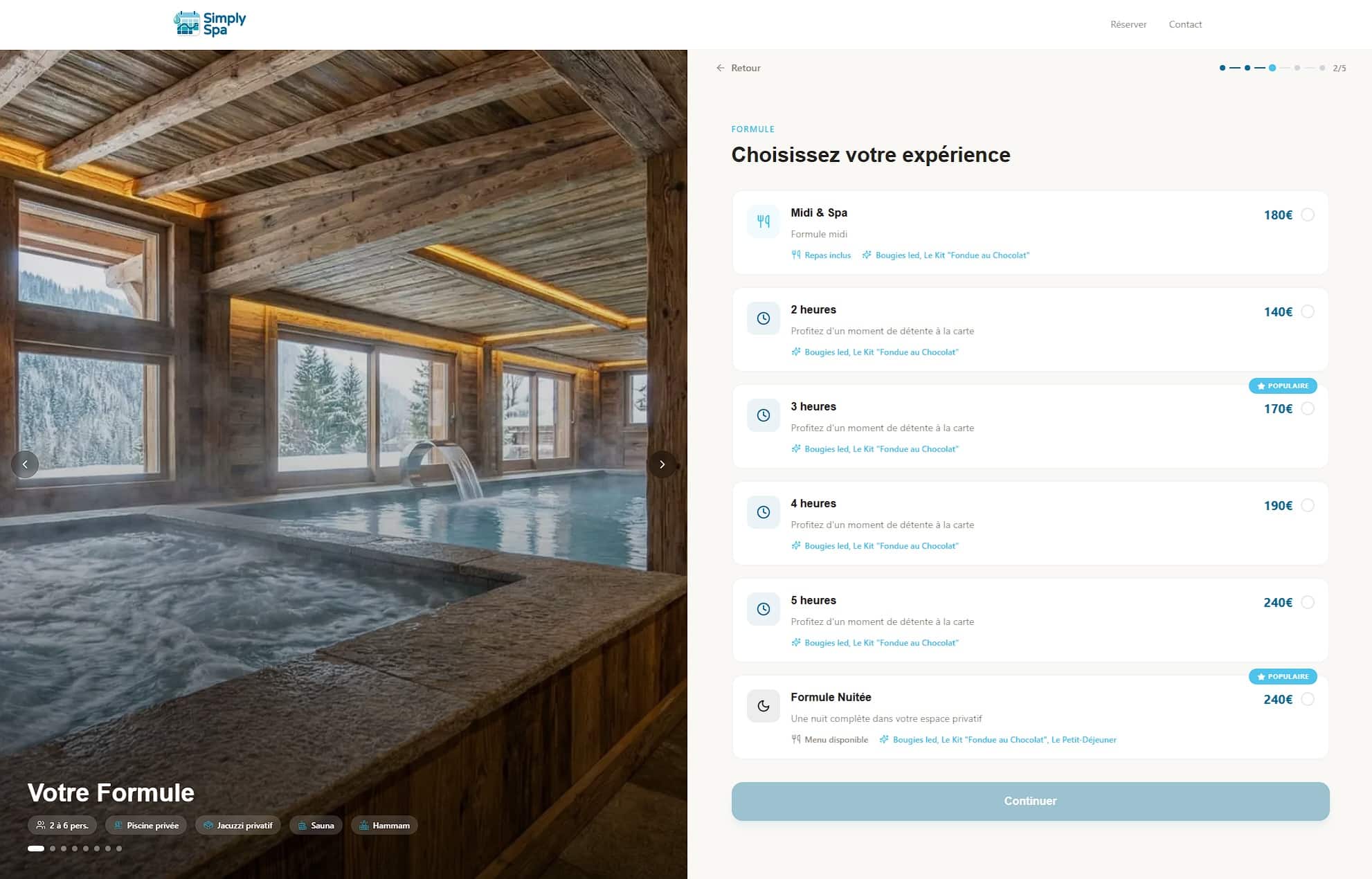 - Recherche par date : certains clients ont parfois un planning chargé. Ils ont un créneau de libre en après-midi et souhaitent profiter d’une séance détente jacuzzi ou d’un soin. Ce parcours leur permet de visualiser directement les prestations disponibles sur un jour spécifique.