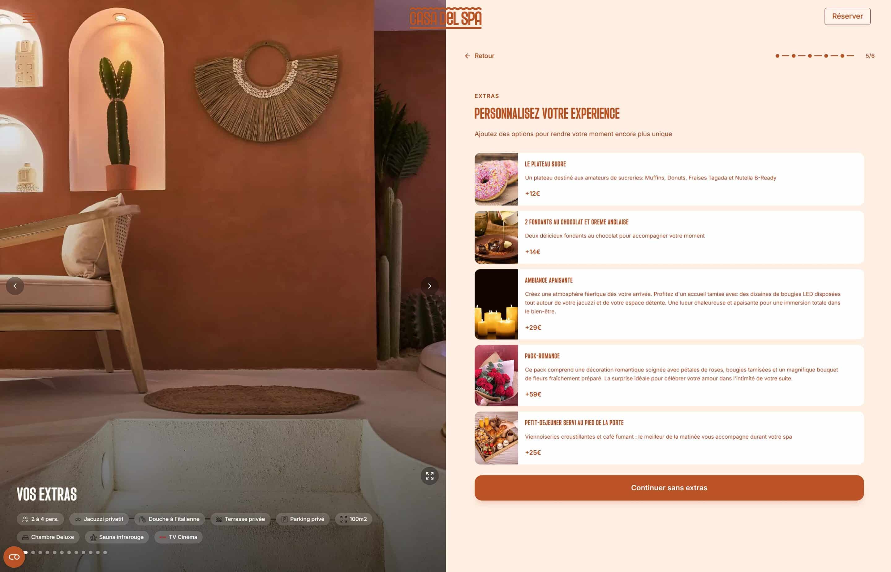 - Ventes Croisées (Cross-selling) : Proposez des options directement dans le tunnel de commande (accès thalasso, option gommage, bouteille de champagne, repas…).